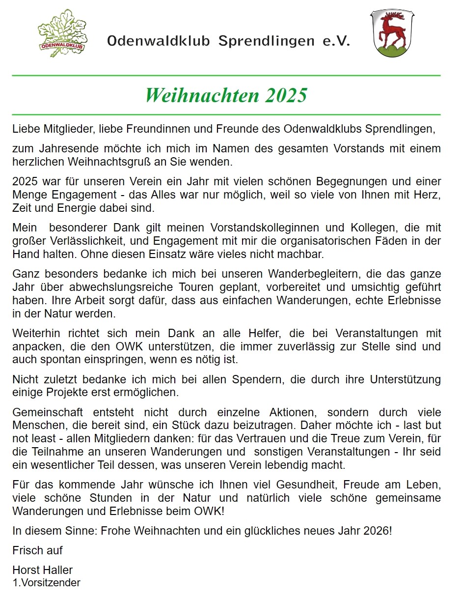 Die Weihnachtszeit gibt uns nun Gelegenheit, das im Jahr erlebte noch einmal in Erinnerung zu rufen und neue Kraft für 2025 zu sammeln. Genießen Sie die Festtage zu Weihnachten und die Vorweihnachtszeit - sie vergeht sowieso für die meisten zu schnell – und bleiben Sie im privaten Bereich sowie für unseren Odenwaldklub positiv gestimmt.
